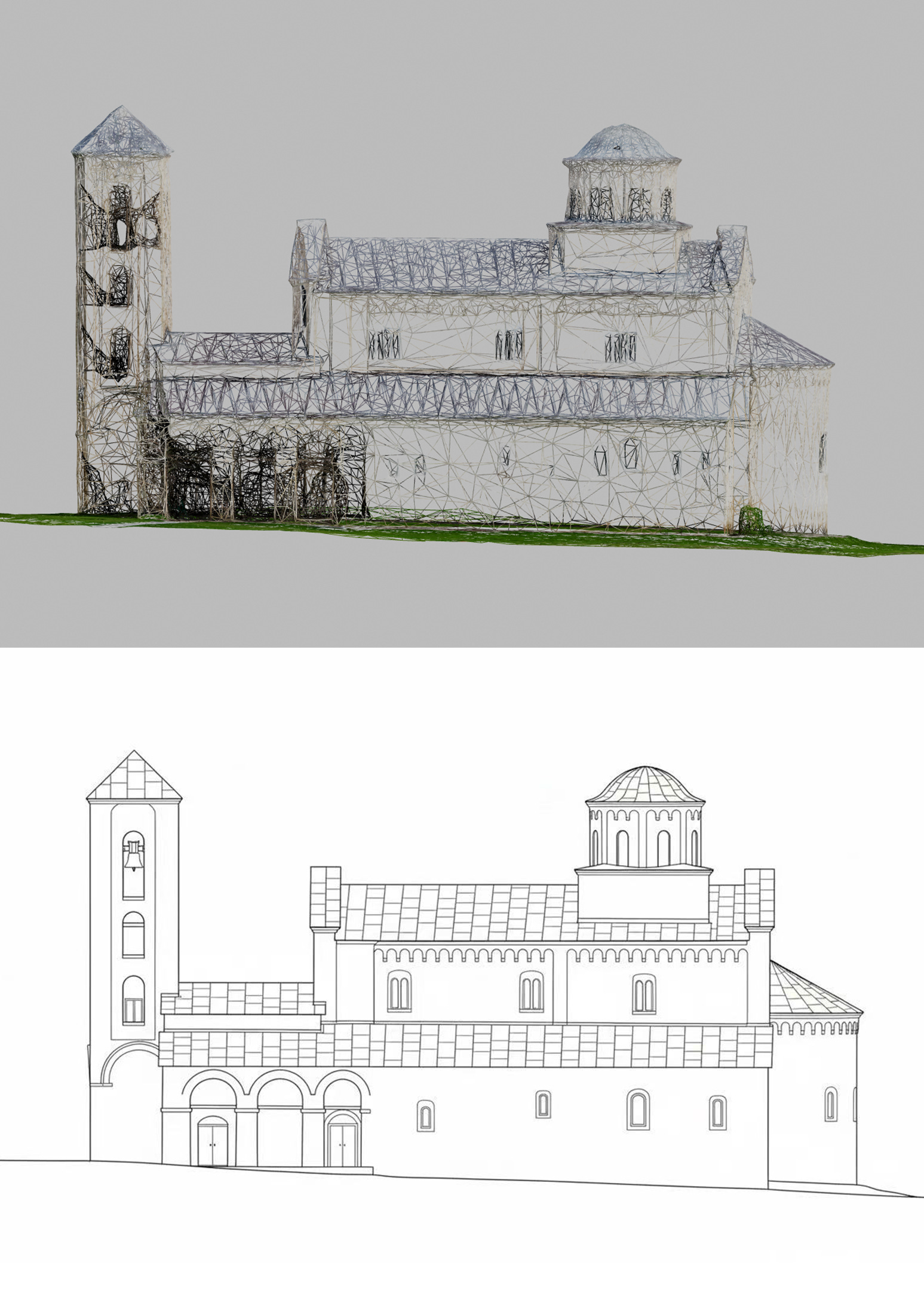 基于「正交浏览」,Funes 依托大量测绘图训练与模型三维结构优化在全球率先实现「测绘线图模式」(survey line-drawing mode),可自动生成考古级别的建筑图纸,包括平面、立面、剖面、总平面、轴测图和正射影像等,其质量符合美国历史建筑调查(HABS)标准,满足学术出版与比较研究的需要。该模式亦采用联合国教科文组织(UNESCO)通用的遗产调查存档格式,有效支持国际文物保护与「申遗」合作。